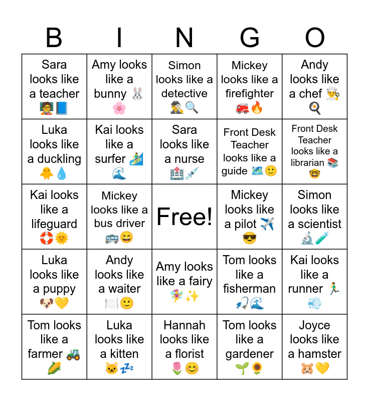This bingo card has a free space and 33 words: Hannah looks like a baker ππ, Joyce looks like a cat π±β¨, Mickey looks like a bus driver ππ, Front Desk Teacher looks like a receptionist ποΈπ, Luka looks like a puppy πΆπ, Kai looks like a surfer πββοΈπ, Andy looks like a chef π¨βπ³π³, Tom looks like a farmer ππ½, Amy looks like a bunny π°πΈ, Sophia looks like a princess ππ, Sara looks like a nurse π₯π, Simon looks like a detective π΅οΈββοΈπ, Hannah looks like a singer π€πΆ, Joyce looks like a panda πΌπ«, Mickey looks like a pilot βοΈπ, Front Desk Teacher looks like a librarian ππ€, Luka looks like a kitten π±π€, Kai looks like a lifeguard ππ, Andy looks like a waiter π½οΈπ, Tom looks like a fisherman π£π, Amy looks like a fairy π§ββοΈβ¨, Sophia looks like a dancer ππ, Sara looks like a teacher π§βπ«π, Simon looks like a scientist π¬π§ͺ, Hannah looks like a florist π·π, Joyce looks like a hamster πΉπ, Mickey looks like a firefighter ππ₯, Front Desk Teacher looks like a guide πΊοΈπ, Luka looks like a duckling π₯π§, Kai looks like a runner πββοΈπ¨, Andy looks like a painter π¨ποΈ, Tom looks like a gardener π±π» and Amy looks like a doll π§Έπ.