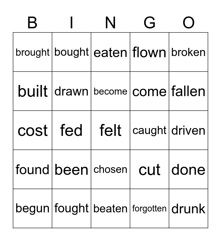 This bingo card has 25 words: been, beaten, become, begun, broken, brought, built, bought, caught, chosen, come, cost, cut, done, drawn, drunk, driven, eaten, fallen, fed, felt, fought, found, flown and forgotten.