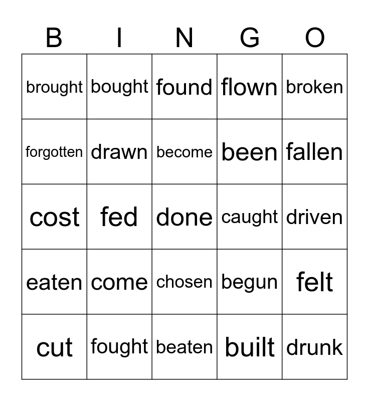 This bingo card has 25 words: come, beaten, become, cut, broken, brought, forgotten, bought, caught, chosen, been, cost, begun, felt, drawn, drunk, driven, found, fallen, fed, done, fought, eaten, flown and built.