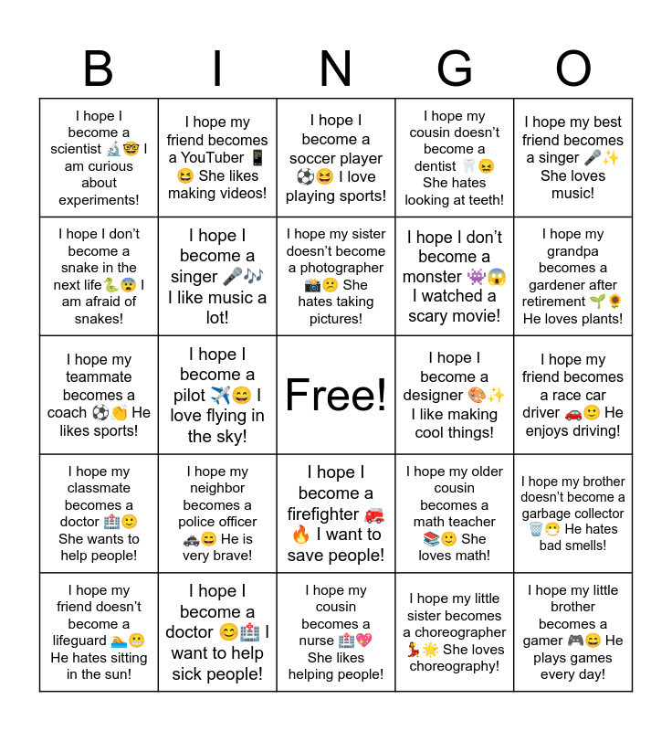 This bingo card has a free space and 30 words: I hope I become a doctor ๐๐ฅ I want to help sick people!, I hope I become a teacher ๐๐ I like helping kids learn!, I hope I become a pilot โ๏ธ๐ I love flying in the sky!, I hope I become a chef ๐ณ๐ I enjoy cooking tasty food!, I hope I become a scientist ๐ฌ๐ค I am curious about experiments!, I hope I become a soccer player โฝ๐ I love playing sports!, I hope I become a singer ๐ค๐ถ I like music a lot!, I hope I become a firefighter ๐๐ฅ I want to save people!, I hope I become a designer ๐จโจ I like making cool things!, I hope my cousin becomes a nurse ๐ฅ๐ She likes helping people!, I hope my friend becomes a race car driver ๐๐ He enjoys driving!, I hope my little brother becomes a gamer ๐ฎ๐ He plays games every day!, I hope my little sister becomes a choreographer ๐๐ She loves choreography!, I hope my big brother becomes a baker ๐๐ He makes great bread!, I hope my grandpa becomes a gardener after retirement ๐ฑ๐ป He loves plants!, I hope my aunt becomes a novelist โ๏ธ๐ She enjoys writing stories stories!, I hope my older cousin becomes a math teacher ๐๐ She loves math!, I hope my classmate becomes a doctor ๐ฅ๐ She wants to help people!, I hope my neighbor becomes a police officer ๐๐ He is very brave!, I hope my best friend becomes a singer ๐คโจ She loves music!, I hope my teammate becomes a coach โฝ๐ He likes sports!, I hope my school friend becomes a pilot โ๏ธ๐ He loves planes!, I hope my friend becomes a YouTuber ๐ฑ๐ She likes making videos!, I hope I donโt become a monster ๐พ๐ฑ I watched a scary movie!, I hope I donโt become a snake in the next life๐๐จ I am afraid of snakes!, I hope my cousin doesnโt become a dentist ๐ฆท๐ She hates looking at teeth!, I hope my brother doesnโt become a garbage collector ๐๏ธ๐ท He hates bad smells!, I hope my friend doesnโt become a lifeguard ๐๐ฌ He hates sitting in the sun!, I hope my sister doesnโt become a photographer ๐ธ๐ She hates taking pictures! and I hope my uncle doesnโt become a fisherman ๐ฃ๐ฃ He hates touching fish!.