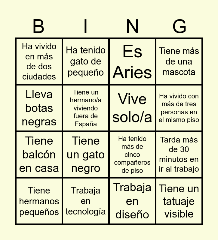 This bingo card has 1 images and 100 words: Lleva zapatillas blancas, Lleva botas negras, Va vestido/a completamente de negro, Lleva algo rojo, Lleva una prenda vaquera, Lleva más de un anillo, Lleva reloj, Lleva pendientes grandes, Lleva collar, Lleva bolso pequeño, Lleva mochila, Lleva gafas de sol en la cabeza, Lleva chaqueta, Lleva manga corta, Tiene las uñas pintadas, Tiene un tatuaje visible, Tiene más de un tatuaje visible, Tiene un piercing visible, Lleva el pelo recogido, Lleva el pelo suelto, Tiene perro, Tiene gato, Tiene un perro pequeño, Tiene un perro grande, Tiene un gato negro, Tiene más de una mascota, Tiene una mascota adoptada, Tiene mascota desde hace más de 5 años, Ha tenido perro de pequeño, Ha tenido gato de pequeño, Es Aries, Es Leo, Es Escorpio, Es Géminis, Es Virgo, Es Libra, Es Piscis, Es Capricornio, Es Acuario, Es Tauro, Tiene hermanos, Tiene más de dos hermanos, Es hijo/a único/a, Tiene hermanos mayores, Tiene hermanos pequeños, Tiene sobrinos, Tiene familia en otra comunidad autónoma, Tiene familia en Galicia, Tiene familia fuera de España, Tiene padres de ciudades diferentes, Tiene un hermano/a viviendo fuera de España, Tiene familia en el mismo barrio, Vive en Barcelona ciudad, Vive en Poblenou, Vive en Gràcia, Vive en Eixample, No es de Barcelona, Lleva menos de dos años en Barcelona, Lleva más de cinco años en Barcelona, Vive solo/a, Comparte piso con amigos, Comparte piso con desconocidos, Vive con su pareja, Vive con sus padres, Tiene balcón en casa, Tiene terraza en casa, Tarda más de 30 minutos en ir al trabajo, Ha vivido fuera de España, Ha vivido en Londres, Ha vivido en otro país europeo, Ha vivido en América, Ha vivido en más de dos ciudades, Se ha mudado de ciudad en los últimos dos años, Ha vivido con más de tres personas en el mismo piso, Ha tenido más de cinco compañeros de piso, Ha viajado solo/a, Ha estado en más de cinco países, Ha cogido un avión este año, Ha ido a un festival este año, Ha vivido en otra ciudad de España, Trabaja en marketing, Trabaja en tecnología, Trabaja en una startup, Trabaja en una empresa grande, Trabaja en ventas, Trabaja en diseño, Trabaja en recursos humanos, Trabaja en finanzas, Trabaja en hostelería, Ha cambiado de trabajo en el último año, Está soltero/a, Está en pareja, Ha tenido más de tres parejas, Ha tenido una relación de más de tres años, Ha vivido con una pareja, Ha tenido una relación a distancia, Tiene un ex viviendo en Barcelona, Tiene un ex con el que sigue hablando, Ha tenido una cita por una app and Ha venido hoy con alguien que conoció hace menos de un mes.