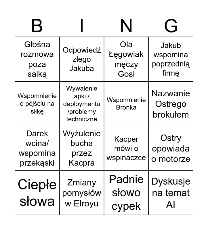 This bingo card has 16 words: Zmiany pomysłów w Elroyu, Ostry opowiada o motorze, Ola Łęgowiak męczy Gosi, Głośna rozmowa poza salką, Darek wcina/ wspomina przekąski, Odpowiedź złego Jakuba, Kacper mówi o wspinaczce, Padnie słowo cypek, Wspomnienie o pójściu na siłkę, Wywalenie apki / deploymentu /problemy techniczne, Ciepłe słowa, Jakub wspomina poprzednią firmę, Wyżulenie bucha przez Kacpra, Nazwanie Ostrego brokułem, Wspomnienie Bronka and Dyskusje na temat AI.