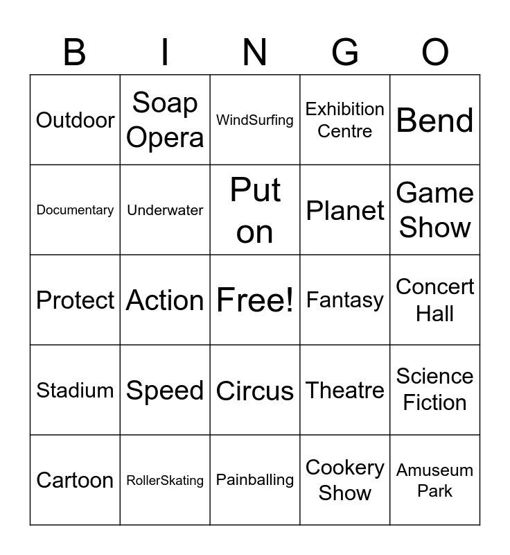 This bingo card has a free space and 24 words: Speed, RollerSkating, Put on, Cartoon, Bend, Outdoor, Documentary, Soap Opera, Fantasy, Circus, Planet, Protect, Theatre, Science Fiction, Underwater, Cookery Show, Concert Hall, WindSurfing, Game Show, Action, Amuseum Park, Stadium, Exhibition Centre and Painballing.