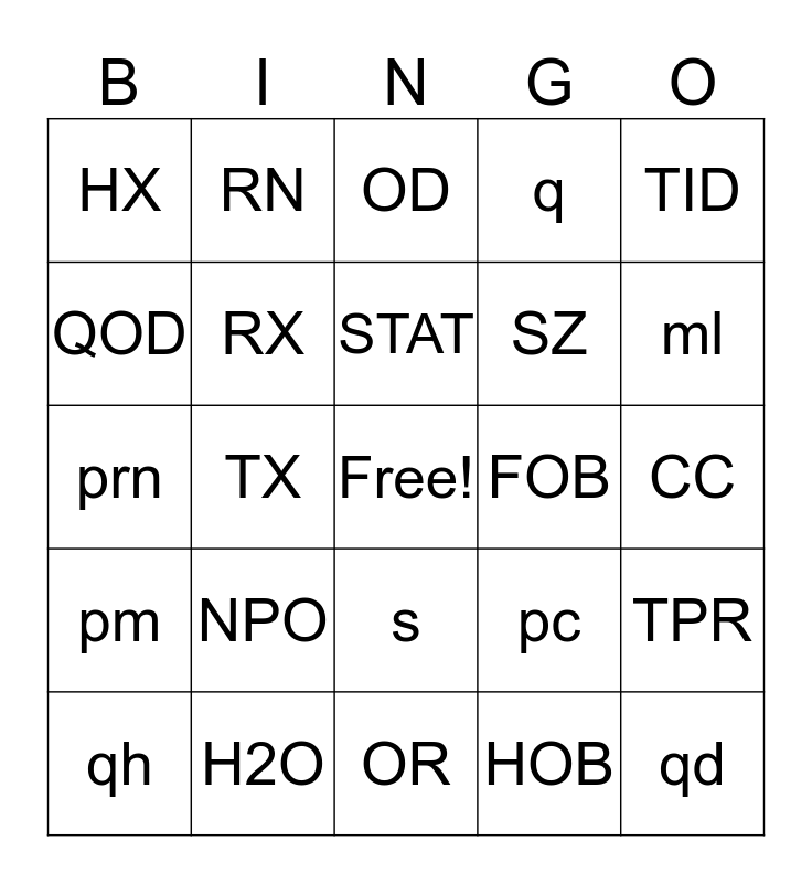 This bingo card has a free space and 24 words: NPO, H2O, STAT, qh, TID, HX, QOD, RN, FOB, s, SZ, prn, pc, TPR, RX, HOB, CC, OD, ml, TX, qd, pm, q and OR.