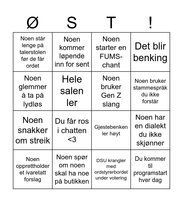 This bingo card has 32 words: Noen sier "kamerater", Noen sier "takk for i går", Noen har en dialekt du ikke skjønner, En annen region er enig med deg, Du kommer til programstart hver dag, Noen bruker Gen Z slang, Noen glemmer å ta på lydløs, Noen går over tiden på talerstolen, Noen kommer løpende inn for sent, Det er kø ved kaffemaskina, Noen bruker stammespråk du ikke forstår, Noen starter en FUMS-chant, Noen sier "Kjære referenter", Noen begår overdreven og åpenbar smisk med FUMS-komiteen, Noen spør om noen skal ha noe på butikken, Noen spør om Paracet, Noen velter drikka si, Gjestebenken ler høyt, Noen får et teknisk problem og må få hjelp, Noen har glemt lader, Ayat ler for høyt, Du hører en brannalarm (Mikkel ler), DSU krangler med ordstyrerbordet under votering, En tar ordet til forretningsorden to ganger, Noen opprettholder et ivaretatt forslag, Det blir benking, Noen snakker om streik, Hele salen ler, Noen står lenge på talerstolen før de får ordet, Noen anklages for å jukse under FUMS, Innleder sier noe som bare de selv synes er gøy and Du får ros i chatten <3.