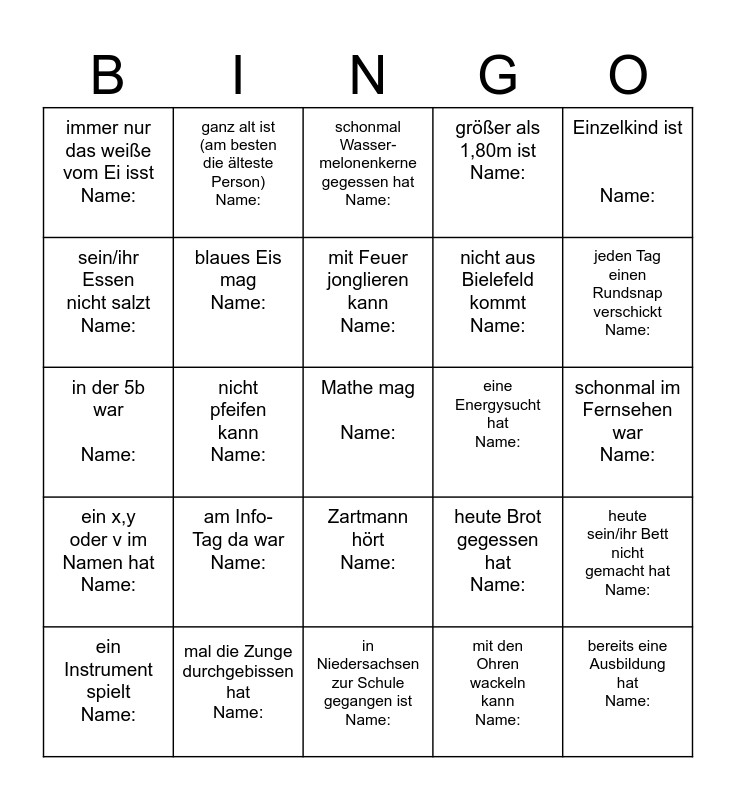 This bingo card has 26 words: Zartmann hört Name:, mit den Ohren wackeln kann Name:, mit Feuer jonglieren kann Name:, mal die Zunge durchgebissen hat Name:, Einzelkind ist Name:, immer nur das weiße vom Ei isst Name:, sein/ihr Essen nicht salzt Name:, ganz alt ist (am besten die älteste Person) Name:, schonmal im Fernsehen war Name:, heute Brot gegessen hat Name:, nicht aus Bielefeld kommt Name:, in der 5b war Name:, heute sein/ihr Bett nicht gemacht hat Name:, ein Instrument spielt Name:, nicht pfeifen kann Name:, als Kind Blockflöte gespielt hat Name:, größer als 1,80m ist Name:, ein x,y oder v im Namen hat Name:, schonmal Wasser- melonenkerne gegessen hat Name:, Mathe mag Name:, jeden Tag einen Rundsnap verschickt Name:, in Niedersachsen zur Schule gegangen ist Name:, eine Energysucht hat Name:, am Info-Tag da war Name:, blaues Eis mag Name: and bereits eine Ausbildung hat Name:.