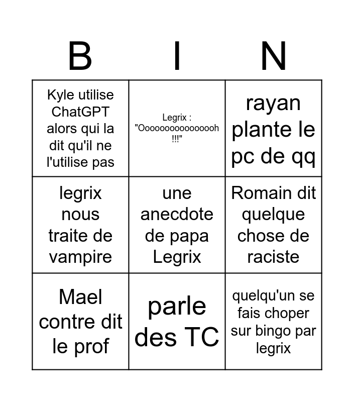 This bingo card has a free space and 8 words: Romain dit quelque chose de raciste, rayan plante le pc de qq, Legrix : "Oooooooooooooooh !!!", Mael contre dit le prof, Kyle utilise ChatGPT alors qui la dit qu'il ne l'utilise pas, quelqu'un se fais choper sur bingo par legrix, legrix nous traite de vampire and parle des TC.