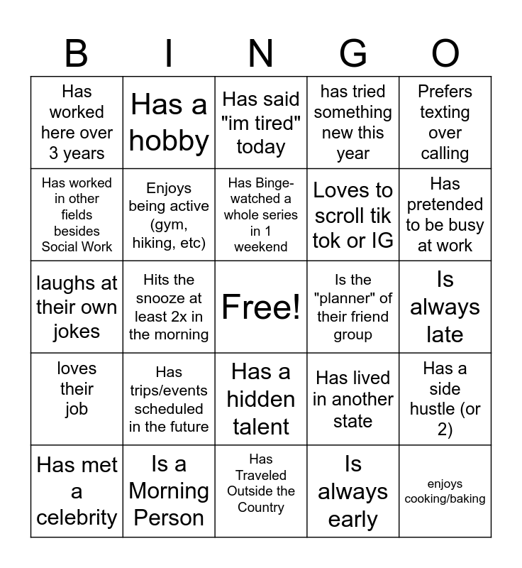 This bingo card has a free space and 24 words: Has trips/events scheduled in the future, Is a Morning Person, Has Binge-watched a whole series in 1 weekend, Has met a celebrity, Prefers texting over calling, Has worked here over 3 years, Has worked in other fields besides Social Work, Has a hobby, Is the "planner" of their friend group, Has a hidden talent, Loves to scroll tik tok or IG, laughs at their own jokes, Has lived in another state, Has a side hustle (or 2), Enjoys being active (gym, hiking, etc), Is always early, Is always late, Has said "im tired" today, Has pretended to be busy at work, Hits the snooze at least 2x in the morning, enjoys cooking/baking, loves their job, has tried something new this year and Has Traveled Outside the Country.