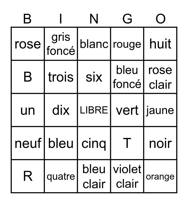 This bingo card has a free space and 41 words: zéro, un, deux, trois, quatre, cinq, six, sept, huit, neuf, dix, rouge, orange, jaune, vert, bleu, violet, rose, gris, blanc, noir, brun, bleu clair, bleu foncé, vert clair, vert foncé, violet clair, violet foncé, rose clair, rose foncé, gris clair, gris foncé, R, C, T, B, D, A, P, W and Z.