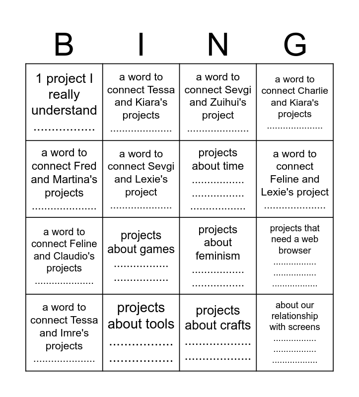 This bingo card has 33 words: Free!, projects about magic ................. ................. .................., projects that need a web browser ................. ................. .................., projects about labor ................. ................. .................., about our relationship with screens ................. ................. .................., projects about time ................. ................. .................., a word to connect Fred and Martina's projects ....................., a word to connect Chrissy and Imre's projects ....................., a word to connect Tessa and Kiara's projects ....................., a word to connect Charlie and Claudio's projects ....................., a word to connect Feline and Lexie's project ....................., a word to connect Sevgi and Zuihui's project ....................., a word to connect Eleni and Wyn's project ....................., projects about belonging ................. ................., projects about tools ................. ................., projects about games ................. ................., projects about languages ................. ................., projects about feminism ................. ................., projects anti-tech ................. ................., projects about nostalgia ................. ................., projects about languages ................. ................., 1 project I don't understand ................., 1 project I really understand ................., projects about crafts ................... ..................., a word to connect Chrissy and Martina's projects ....................., a word to connect Tessa and Imre's projects ....................., a word to connect Charlie and Kiara's projects ....................., a word to connect Feline and Claudio's projects ....................., a word to connect Sevgi and Lexie's project ....................., a word to connect Eleni and Zuihui's project ...................., a word to connect Fred and Wyn's project ...................., projects about administration ................. ................. and projects about politics ................. ..................