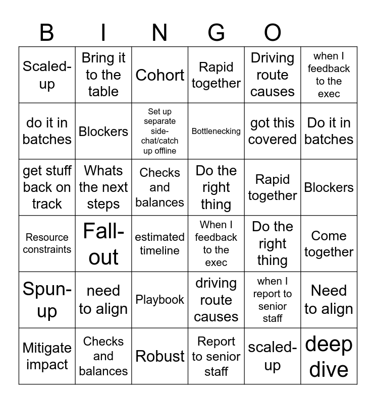This bingo card has 69 words: Pulling in the same direction, Checks and balances, Belts and braces approach, Report to senior staff, When I feedback to the exec, Spun-up, Rapid together, Get stuff back on track, Driving route causes, All the good work Liam is doing, Fall-out, Estimated timeline, Scaled-up, Cohort, Give me some steer, Do it in batches, Blockers, Set up separate side-chat/catch up offline, Mitigate impact, Do the right thing, Whats the next steps, Resource constraints, Bottlenecking, Playbook, Need to align, Got this covered, Shift focus, Circle/cycle back, Come together, Deep dive, Bring it to the table, Drill down, Pain points, Alignment, Robust, Checks and balances, belts and braces approach, when I report to senior staff, when I feedback to the exec, Spun-up, Rapid together, get stuff back on track, driving route causes, all the good work Liam is doing, fall-out, estimated timeline, scaled-up, cohort, give me some steer, do it in batches, Blockers, set up separate side-chat/catch up offline, Mitigate impact, Do the right thing, whats the next steps, resource constraints, bottlenecking, playbook, need to align, got this covered, shift focus, circle/cycle back, come together, deep dive, bring it to the table, drill down, pain points, alignment and robust.