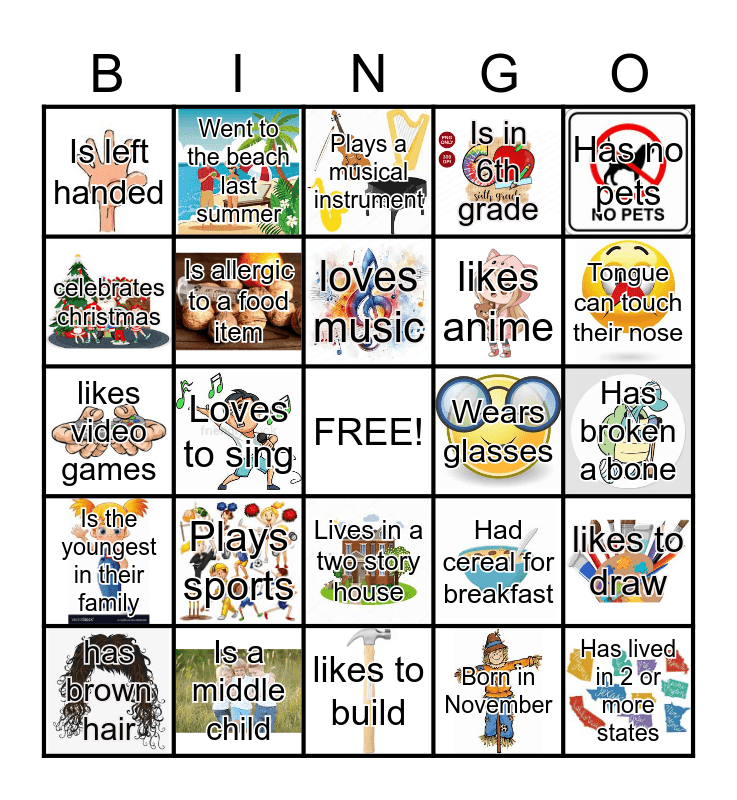 This bingo card has 30 images, a free space and 30 words: Is a middle child, Is the oldest in their family, Loves to sing, Has a dog, Is left handed, Plays a musical instrument, Is allergic to a food item, Lives in a two story house, Wears glasses, likes to build, Has broken a bone, Has lived in 2 or more states, Born in November, Has 3 siblings, Tongue can touch their nose, Has a cat, Had cereal for breakfast, Is the youngest in their family, Plays sports, Has no pets, likes video games, Has been in a wedding, Went to the beach last summer, likes anime, celebrates christmas, Is in 6th grade, likes to draw, has brown hair, loves music and likes scary movies.