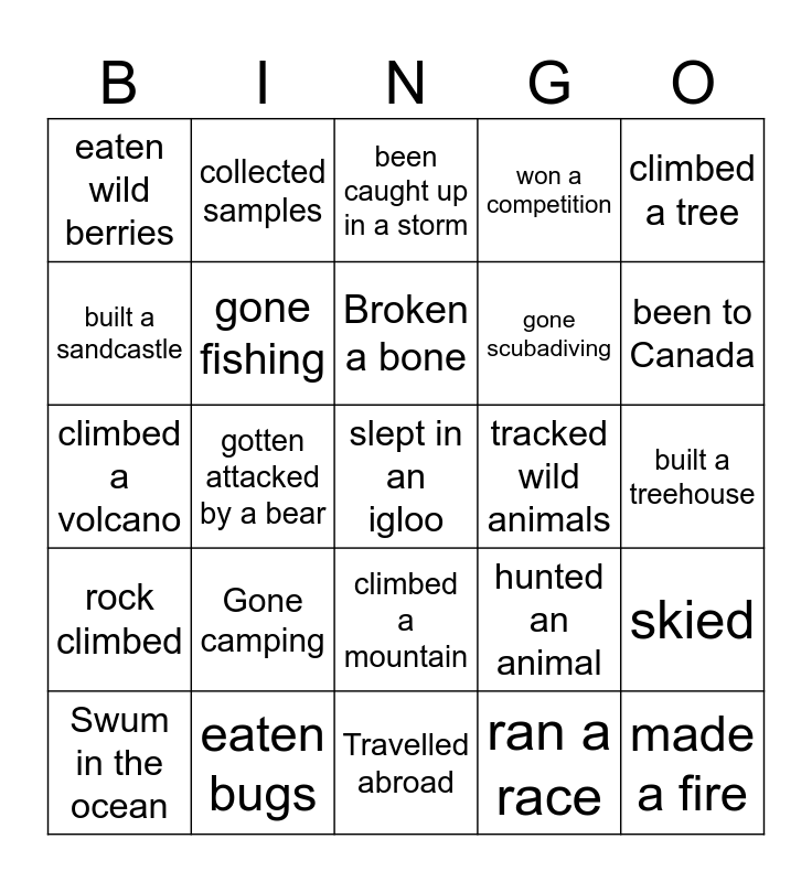 This bingo card has 25 words: Gone camping, Travelled abroad, Broken a bone, Swum in the ocean, climbed a tree, eaten wild berries, built a sandcastle, collected samples, tracked wild animals, climbed a mountain, gone scubadiving, climbed a volcano, hunted an animal, skied, gone fishing, made a fire, built a treehouse, been caught up in a storm, been to Canada, gotten attacked by a bear, slept in an igloo, eaten bugs, rock climbed, won a competition and ran a race.