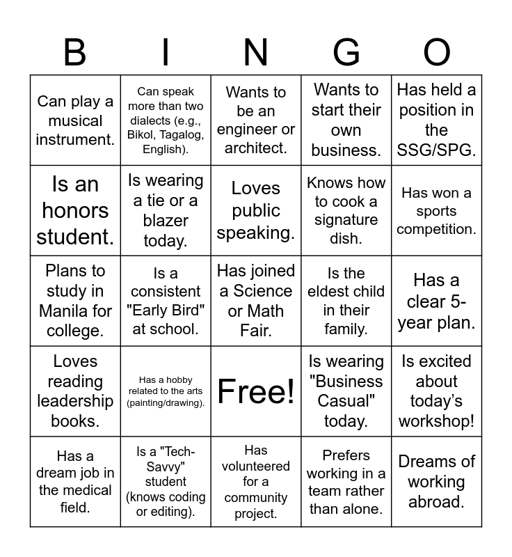 This bingo card has 26 words: Free!, Has a dream job in the medical field., Is wearing a tie or a blazer today., Can name three leadership qualities., Wants to start their own business., Has held a position in the SSG/SPG., Is an honors student., Can speak more than two dialects (e.g., Bikol, Tagalog, English)., Loves public speaking., Prefers working in a team rather than alone., Has won a sports competition., Plans to study in Manila for college., Is a "Tech-Savvy" student (knows coding or editing)., Has volunteered for a community project., Is the eldest child in their family., Dreams of working abroad., Can play a musical instrument., Has a hobby related to the arts (painting/drawing)., Wants to be an engineer or architect., Is wearing "Business Casual" today., Has a clear 5-year plan., Loves reading leadership books., Is a consistent "Early Bird" at school., Has joined a Science or Math Fair., Knows how to cook a signature dish. and Is excited about today’s workshop!.