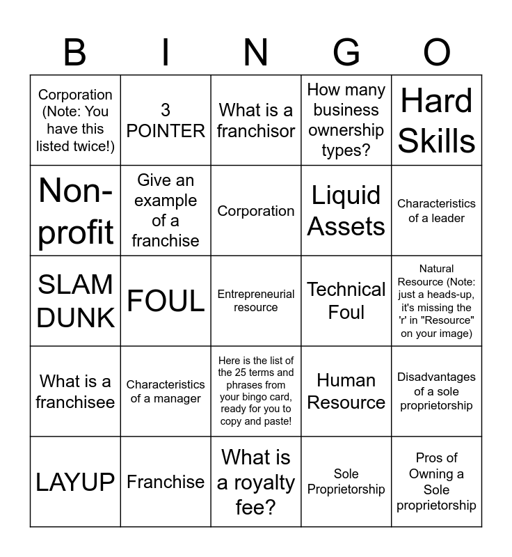 This bingo card has 26 words: Here is the list of the 25 terms and phrases from your bingo card, ready for you to copy and paste!, Sole Proprietorship, Corporation, Franchise, Hard Skills, Corporation (Note: You have this listed twice!), Non-profit, 3 POINTER, Natural Resource (Note: just a heads-up, it's missing the 'r' in "Resource" on your image), Human Resource, Liquid Assets, SLAM DUNK, Disadvantages of a sole proprietorship, LAYUP, FOUL, COMPANY BRANDING SHOWN, How many business ownership types?, What is a franchisee, What is a franchisor, Entrepreneurial resource, Characteristics of a leader, What is a royalty fee?, Technical Foul, Characteristics of a manager, Give an example of a franchise and Pros of Owning a Sole proprietorship.