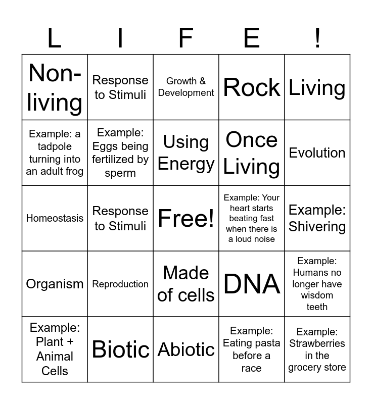This bingo card has a free space and 24 words: Example: Plant + Animal Cells, Reproduction, Using Energy, Example: Eating pasta before a race, Living, Non-living, Response to Stimuli, Growth & Development, Example: Your heart starts beating fast when there is a loud noise, Example: Shivering, Homeostasis, Example: Eggs being fertilized by sperm, DNA, Example: Humans no longer have wisdom teeth, Example: a tadpole turning into an adult frog, Biotic, Abiotic, Rock, Evolution, Organism, Response to Stimuli, Made of cells, Once Living and Example: Strawberries in the grocery store.