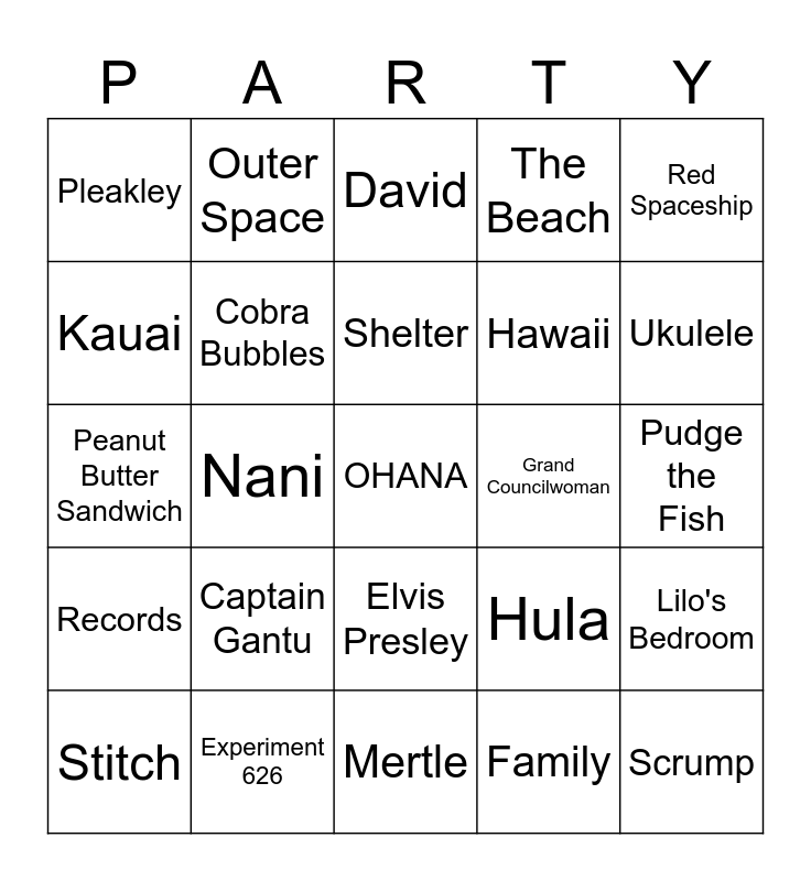 This bingo card has a free space and 29 words: Stitch, Lilo, Nani, Jumba, Pleakley, David, Cobra Bubbles, Captain Gantu, Grand Councilwoman, Experiment 626, Pudge the Fish, Scrump, Mertle, Family, Ukulele, Surfboard, Elvis Presley, Records, Red Spaceship, Peanut Butter Sandwich, Hula, Photographs, Hawaii, Kauai, The Beach, Outer Space, Lilo's Bedroom, Shelter and Tsunami.