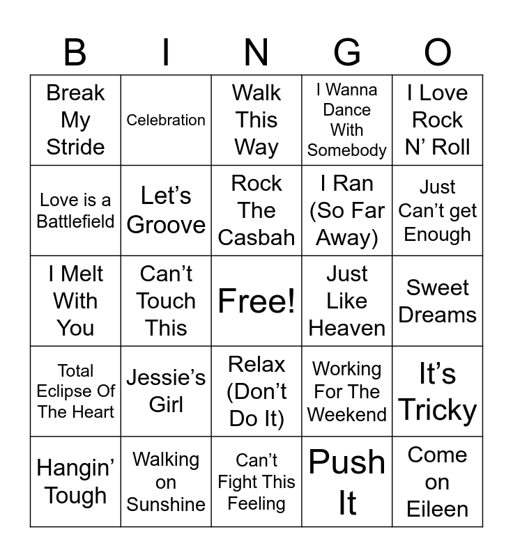 This bingo card has a free space and 102 words: Love Shack, Faith, I Love Rock N’ Roll, Our Lips Are Sealed, Jump, Take On Me, Billy Jean, Girls Just Want To Have Fun, Maneater, Footloose, Dancing In The Dark, Never Gonna Give You Up, Whip It, Sweet Child O’ Mine, All Night Long, Call Me, Total Eclipse Of The Heart, Don’t You Want Me, Don’t Stop Believin’, Livin’ On A Prayer, Like A Prayer, Wake Me Up Before You Go-Go, Africa, You Give Love A Bad Name, Kokomo, Just Can’t get Enough, I Wanna Dance With Somebody, Jessie’s Girl, Mickey, Safety Dance, Celebration, Walk This Way, Pour Some Sugar On me, Eye Of The Tiger, Straight Up, Relax (Don’t Do It), Karma Chameleon, We Built This City, I Melt With You, Push It, I Think We're Alone Now, Fight For Your Right, Hangin’ Tough, Hit Me With Your Best Shot, Holiday, Hot Hot Hot, I Hate Myself For Loving You, I Ran (So Far Away), Into the Groove, Kiss, Material Girl., Thriller, Love is a Battlefield, Walk Like an Egyptian, Beat It, Burning Down the House, How Will I Know, Hungry Like the Wolf, Tainted Love, Come on Eileen, We Got the Beat, Our Lips are Sealed, Express Yourself, Come to Me, Centerfold, Separate Ways, Summer of 69, Sweet Dreams, Can’t Touch This, Walking on Sunshine, Spring Love, Maria, Dream Boy/Dream Girl, Under Pressure, Your Love, Danger Zone, Let’s Groove, Everybody Wants To Rule The World, Should I Stay Or Should I Go, You Shook Me All Night Long, Uptown Girl, Down Under, Another One Bites The Dust, Just Like Heaven, You Make My Dreams (Come True), Rock The Casbah, You Spin Me Round, The Final Countdown, Let’s Dance, Keep On Loving You, Any Way You Want It, Working For The Weekend, Thunderstruck, Crazy Train, Two Tickets To Paradise, Can’t Fight This Feeling, Break My Stride, Making Love Out Of Nothing At all, It’s Tricky, 867-5309/Jenny, What I like About You and Tell It To My Heart.