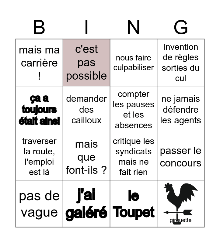 This bingo card has 1 images and 16 words: j'ai galéré, passer le concours, nous faire culpabiliser, mais ma carrière !, traverser la route, l'emploi est là, c'est pas possible, critique les syndicats mais ne fait rien, le Toupet, ça a toujours était ainsi, demander des cailloux, pas de vague, Invention de règles sorties du cul, mais que font-ils ?, ne jamais défendre les agents, compter les pauses et les absences and girouette.