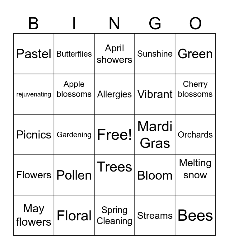 This bingo card has a free space and 27 words: Bloom, Renewal, Vibrant, Spring Cleaning, rejuvenating, April showers, Butterflies, Flowers, Mardi Gras, Melting snow, Picnics, Sunshine, May flowers, Floral, Cherry blossoms, Bouquet, Apple blossoms, Allergies, Pollen, Pastel, Orchards, Streams, Gardening, Bees, Trees, Green and Birds.