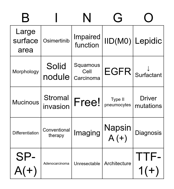 This bingo card has a free space and 35 words: Elle B. O’Lee, Dyspnea, Lymphadenopathy, Solid nodule, Imaging, IID(M0), Morphology, Lung Carcinoma, Squamous Cell Carcinoma, Adenocarcinoma in Situ (AIS), Mucinous, Lepidic, Cell clusters, Grade 3, Large surface area, Type II pneumocytes, Architecture, Stromal invasion, Differentiation, TTF-1(+), Napsin A (+), SP-A(+), Diagnosis, Adenocarcinoma, Impaired function, ↓ Surfactant, Hypoxia, Cough, EGFR, Driver mutations, Targeted therapy, Unresectable, Conventional therapy, Osimertinib and 18.9 months.