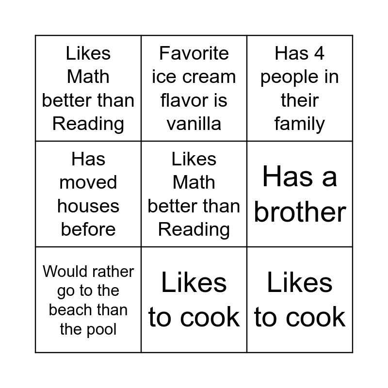 This bingo card has a free space and 13 words: Favorite color is red, Has a pet, Would rather go to the beach than the pool, Favorite ice cream flavor is vanilla, Has moved houses before, Likes to cook, Has a sister, Has 4 people in their family, Likes to cook, Likes Math better than Reading, Has a brother, Has 4 people in their family and Likes kpop.