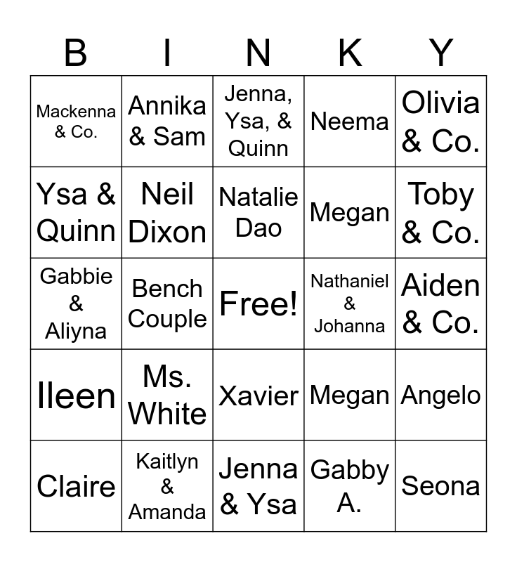 This bingo card has a free space and 27 words: Megan, Megan, Megan, Jenna & Ysa, Ysa & Quinn, Jenna, Ysa, & Quinn, Annika & Sam, Ileen, Nathaniel & Johanna, Angelo, Gabbie & Aliyna, Neema, Claire, Kaitlyn & Amanda, Toby & Co., Nadia & Co., Neil Dixon, Natalie Dao, Ms. White, Mackenna & Co., Aiden & Co., Gabby A., Bench Couple, Seona, Xavier, Olivia & Co. and Daphne & Co..