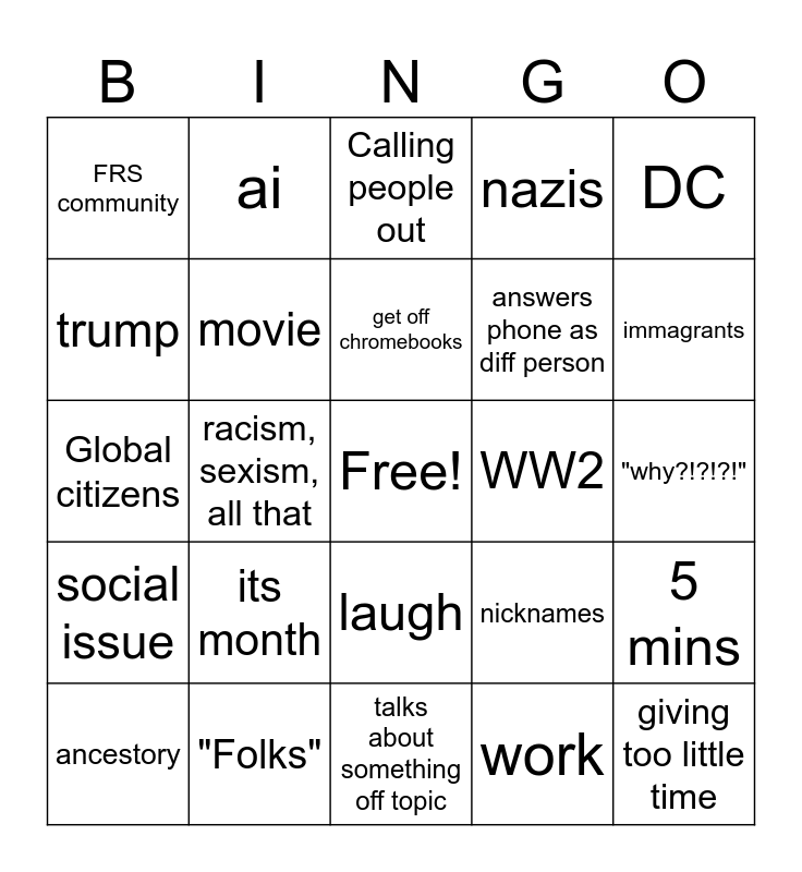 This bingo card has a free space and 24 words: its month, "Folks", get off chromebooks, ancestory, DC, FRS community, trump, ai, WW2, laugh, answers phone as diff person, Global citizens, nicknames, 5 mins, movie, work, "why?!?!?!", Calling people out, immagrants, racism, sexism, all that, giving too little time, social issue, nazis and talks about something off topic.