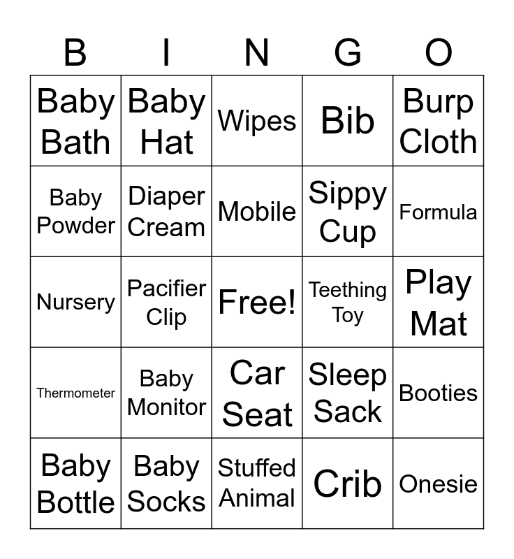 This bingo card has a free space and 45 words: Diapers, Onesie, Pacifier, Baby Bottle, Stroller, Crib, Wipes, Baby Blanket, Burp Cloth, Baby Socks, Bib, Teething Toy, Car Seat, Baby Monitor, Swaddle, Stuffed Animal, Baby Lotion, Nursery, Baby Book, Formula, Baby Hat, Changing Table, Rocking Chair, Baby Bath, High Chair, Play Mat, Diaper Bag, Rattle, Sleep Sack, Thermometer, Baby Shampoo, Booties, Blanket, Bottle Warmer, Sound Machine, Pacifier Clip, Nursing Pillow, Tummy Time, Cradle, Mobile, Baby Powder, Sippy Cup, Changing Pad, Diaper Cream and Wipes Warmer.