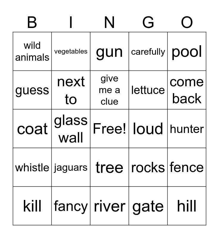 This bingo card has a free space and 29 words: kill, strong, glass wall, safe, wild animals, gun, next to, jaguars, loud, fancy, hunter, hill, river, gate, come back, cubs, tree, whistle, pool, coat, rocks, out off, lettuce, guess, carefully, vegetables, fence, give me a clue and all kinds of animals.