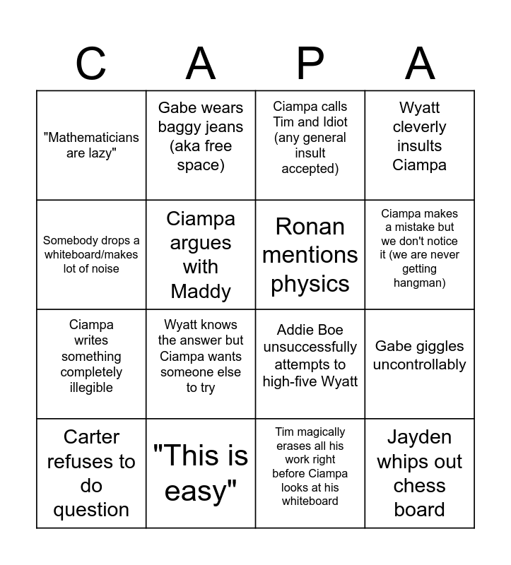 This bingo card has 16 words: Carter refuses to do question, "This is easy", Ciampa calls Tim and Idiot (any general insult accepted), Wyatt cleverly insults Ciampa, Somebody drops a whiteboard/makes lot of noise, Gabe wears baggy jeans (aka free space), Addie Boe unsuccessfully attempts to high-five Wyatt, Gabe giggles uncontrollably, "Mathematicians are lazy", Ciampa argues with Maddy, Tim magically erases all his work right before Ciampa looks at his whiteboard, Ciampa makes a mistake but we don't notice it (we are never getting hangman), Ciampa writes something completely illegible, Wyatt knows the answer but Ciampa wants someone else to try, Ronan mentions physics and Jayden whips out chess board.