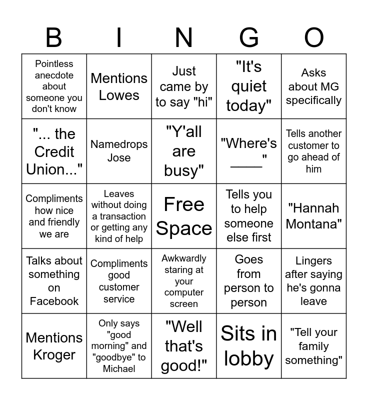 This bingo card has a free space and 24 words: Compliments good customer service, Only says "good morning" and "goodbye" to Michael, "Y'all are busy", Mentions Kroger, Asks about MG specifically, Pointless anecdote about someone you don't know, "... the Credit Union...", Mentions Lowes, Tells you to help someone else first, Awkwardly staring at your computer screen, "Where's ____", Compliments how nice and friendly we are, Goes from person to person, Lingers after saying he's gonna leave, Namedrops Jose, Sits in lobby, "Hannah Montana", Just came by to say "hi", Tells another customer to go ahead of him, Leaves without doing a transaction or getting any kind of help, "Tell your family something", Talks about something on Facebook, "It's quiet today" and "Well that's good!".