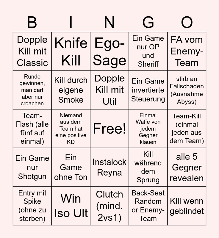 This bingo card has a free space and 24 words: Ein Game ohne Ton, Win Iso Ult, Dopple Kill mit Util, Entry mit Spike (ohne zu sterben), FA vom Enemy-Team, Dopple Kill mit Classic, Runde gewinnen, man darf aber nur croachen, Knife Kill, Einmal Waffe von jedem Gegner klauen, Instalock Reyna, Ein Game invertierte Steuerung, Team-Flash (alle fünf auf einmal), Kill während dem Sprung, alle 5 Gegner revealen, Kill durch eigene Smoke, Back-Seat Random or Enemy- Team, Team-Kill (einmal jeden aus dem Team), Ego-Sage, stirb an Fallschaden (Ausnahme Abyss), Niemand aus dem Team hat eine positive KD, Kill wenn geblindet, Ein Game nur Shotgun, Ein Game nur OP und Sheriff and Clutch (mind. 2vs1).