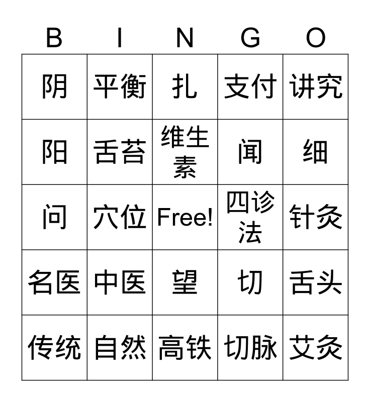 This bingo card has a free space and 24 words: 中医, 自然, 维生素, 传统, 讲究, 阴, 阳, 平衡, 四诊法, 望, 闻, 问, 切, 舌头, 舌苔, 切脉, 针灸, 扎, 细, 穴位, 艾灸, 名医, 支付 and 高铁.