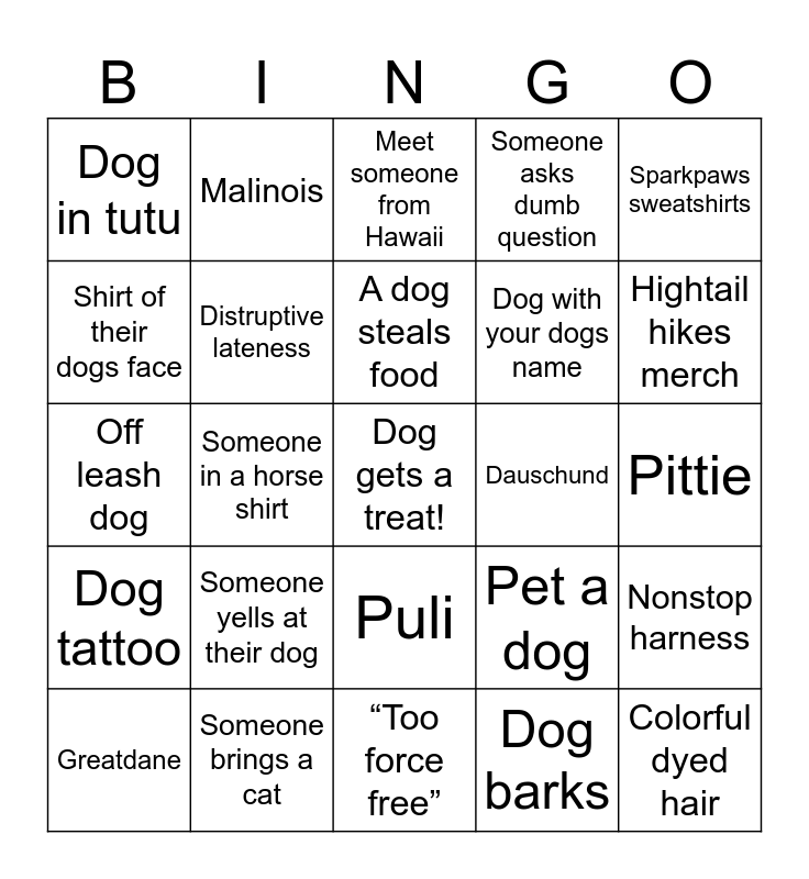 This bingo card has a free space and 24 words: Someone yells at their dog, Someone brings a cat, A dog steals food, Greatdane, Sparkpaws sweatshirts, Dog in tutu, Shirt of their dogs face, Malinois, Dauschund, Puli, Dog with your dogs name, Off leash dog, Pet a dog, Nonstop harness, Distruptive lateness, Dog barks, Pittie, Meet someone from Hawaii, Hightail hikes merch, Someone in a horse shirt, Colorful dyed hair, Dog tattoo, Someone asks dumb question and “Too force free”.