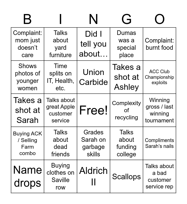 This bingo card has a free space and 25 words: Talks about dead friends, Aldrich II, Union Carbide, Name drops, Complaint: burnt food, Complaint: mom just doesn’t care, Shows photos of younger women, Talks about yard furniture, Complexity of recycling, Grades Sarah on garbage skills, Takes a shot at Ashley, Takes a shot at Sarah, Talks about funding college, Compliments Sarah’s nails, Time splits on IT, Health, etc., Scallop biz needed; no golf or farm, Winning gross / last winning tournament, Did I tell you about…, ACC Club Championship exploits, Talks about great Apple customer service, Talks about a bad customer service rep, Buying clothes on Saville row, Buying ACK / Selling Farm combo, Dumas was a special place and Scallops.