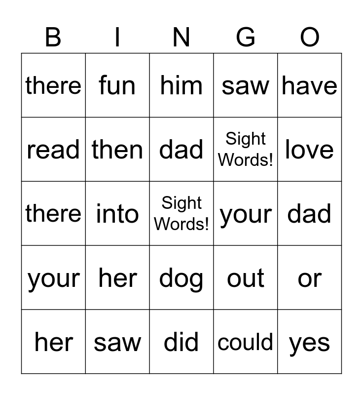 This bingo card has a free space and 51 words: said, yes, love, did, her, him, fun, eat, read, sit, then, saw, or, out, how, mom,, dad, your, very, have, into, could, there, Sight Words!, said, yes, love, did, her, him, fun, eat, read, sit, then, saw, or, out, how, mom, dad, your, very, have, into, could, there, the, cat, dog and dislike.