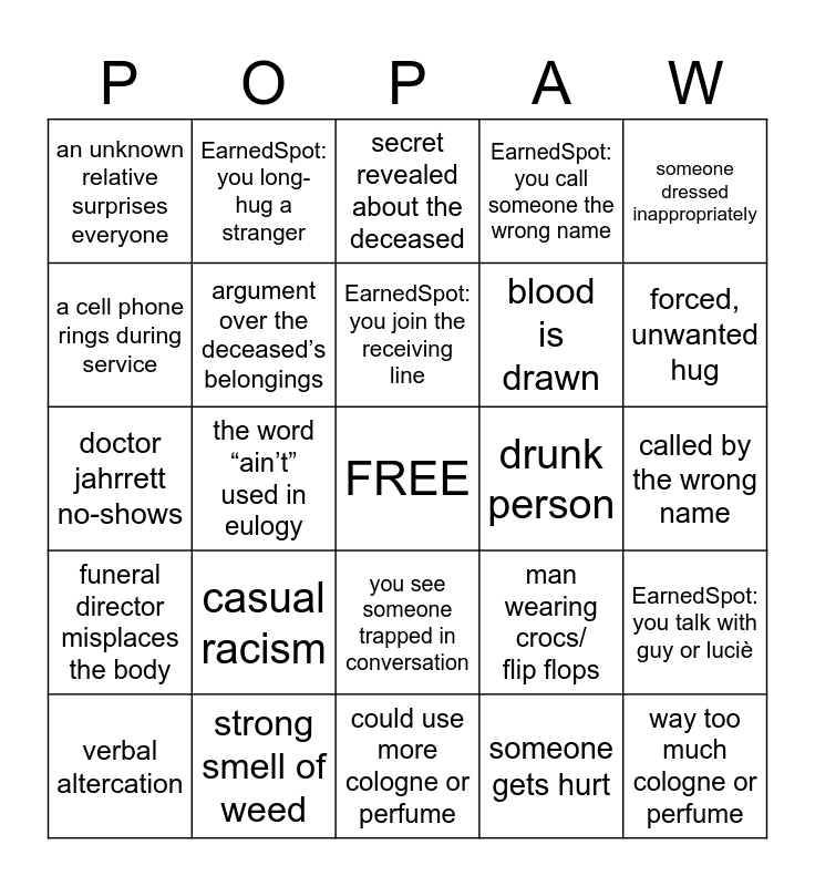 This bingo card has a free space and 29 words: verbal altercation, physical altercation, the word “ain’t” used in eulogy, at least one magic trick performance, an unknown relative surprises everyone, secret revealed about the deceased, argument over the deceased’s belongings, casual racism, drunk person, strong smell of weed, called by the wrong name, way too much cologne or perfume, could use more cologne or perfume, someone gets hurt, forced, unwanted hug, someone aks where nikki koe be, you see someone trapped in conversation, funeral director misplaces the body, someone dressed inappropriately, doctor jahrrett no-shows, man wearing crocs/ flip flops, invasion of personal space, blood is drawn, a cell phone rings during service, EarnedSpot: you call someone the wrong name, EarnedSpot: you long-hug a stranger, EarnedSpot: you talk with guy or luciè, EarnedSpot: you join the receiving line and EarnedSpot: you take a dump in the bathroom.
