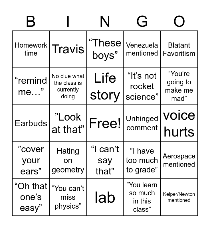 This bingo card has a free space and 24 words: Hating on geometry, ”You can’t miss physics”, Life story, “Oh that one’s easy”, Blatant Favoritism, Homework time, “remind me…”, Travis, Unhinged comment, “I can’t say that”, “It’s not rocket science”, Earbuds, ”I have too much to grade”, Aerospace mentioned, No clue what the class is currently doing, ”You learn so much in this class”, voice hurts, “These boys”, ”You’re going to make me mad”, ”Look at that”, Kelper/Newton mentioned, ”cover your ears”, Venezuela mentioned and lab.