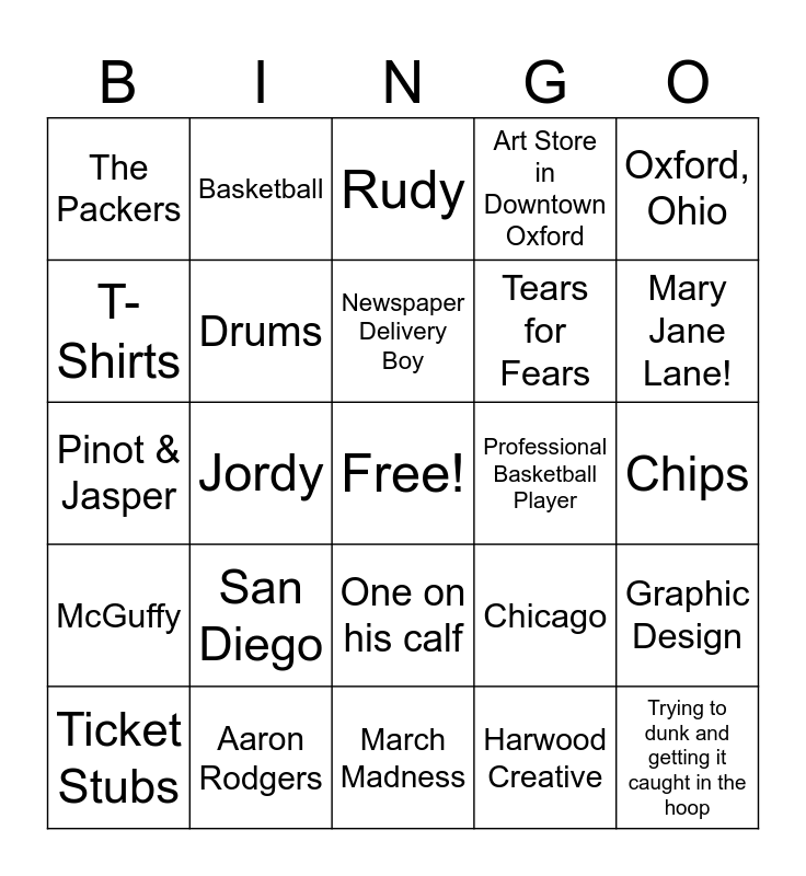 This bingo card has a free space and 32 words: Harwood Creative, Mustang (1969), Jordy, Michael Jordan, McGuffy, Drums, Oxford, Ohio, Graphic Design, Basketball, Robert, Newspaper Delivery Boy, Rudy, Sixty!, Loverboy or the Kinks at Mullet Hall in Oxford, Professional Basketball Player, Mint Chocolate Chip, Ticket Stubs, Pinot & Jasper, One on his calf, San Diego, Chicago, Anything Pretzel, Chips, Aaron Rodgers, Trying to dunk and getting it caught in the hoop, Art Store in Downtown Oxford, Tears for Fears, T-Shirts, The Packers, March Madness, His Birthday! and Mary Jane Lane!.