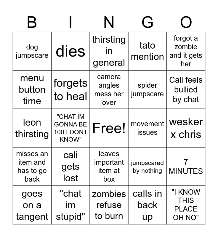 This bingo card has a free space and 24 words: cali gets lost, "chat im stupid", camera angles mess her over, goes on a tangent, forgot a zombie and it gets her, dog jumpscare, menu button time, dies, movement issues, leaves important item at box, spider jumpscare, leon thirsting, jumpscared by nothing, 7 MINUTES, forgets to heal, calls in back up, wesker x chris, thirsting in general, Cali feels bullied by chat, "CHAT IM GONNA BE 100 I DONT KNOW", "I KNOW THIS PLACE OH NO", misses an item and has to go back, tato mention and zombies refuse to burn.