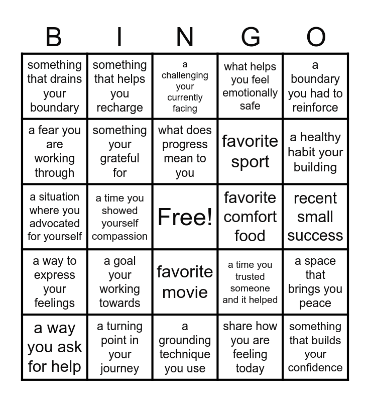 This bingo card has a free space and 24 words: a goal your working towards, a turning point in your journey, what does progress mean to you, a way you ask for help, a boundary you had to reinforce, something that drains your boundary, a fear you are working through, something that helps you recharge, favorite comfort food, favorite movie, favorite sport, a situation where you advocated for yourself, a time you trusted someone and it helped, a space that brings you peace, something your grateful for, share how you are feeling today, recent small success, a challenging your currently facing, a healthy habit your building, a time you showed yourself compassion, something that builds your confidence, a way to express your feelings, what helps you feel emotionally safe and a grounding technique you use.