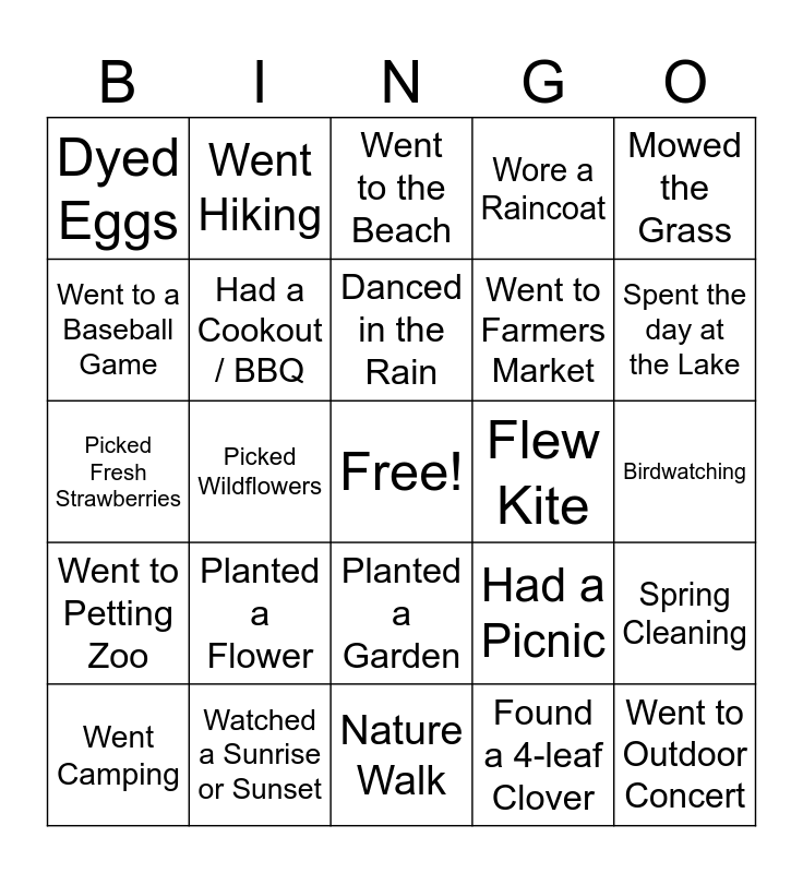This bingo card has a free space and 24 words: Planted a Flower, Watched a Sunrise or Sunset, Danced in the Rain, Went Camping, Mowed the Grass, Dyed Eggs, Went to a Baseball Game, Went Hiking, Flew Kite, Planted a Garden, Went to Farmers Market, Picked Fresh Strawberries, Had a Picnic, Spring Cleaning, Had a Cookout / BBQ, Found a 4-leaf Clover, Birdwatching, Went to the Beach, Spent the day at the Lake, Picked Wildflowers, Went to Outdoor Concert, Went to Petting Zoo, Wore a Raincoat and Nature Walk.