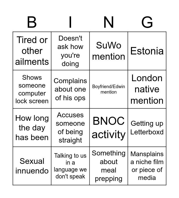 This bingo card has 16 words: Talking to us in a language we don't speak, Getting up Letterboxd, SuWo mention, Tired or other ailments, How long the day has been, Doesn't ask how you're doing, BNOC activity, Something about meal prepping, Shows someone computer lock screen, Complains about one of his ops, Sexual innuendo, Estonia, Accuses someone of being straight, London native mention, Boyfriend/Edwin mention and Mansplains a niche film or piece of media.