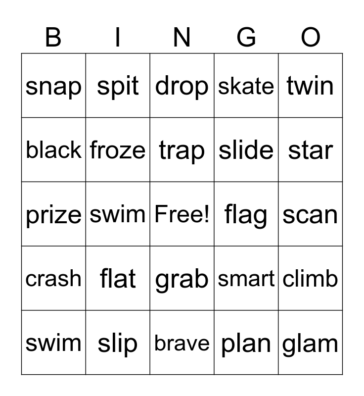 This bingo card has a free space and 24 words: flat, slip, trap, swim, twin, snap, black, spit, flag, grab, slide, prize, smart, climb, froze, plan, scan, drop, star, swim, glam, crash, skate and brave.