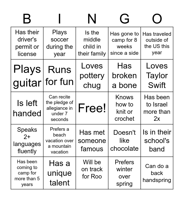 This bingo card has a free space and 24 words: Prefers a beach vacation over a mountain vacation, Has a unique talent, Loves pottery chug, Has been coming to camp for more than 5 years, Has traveled outside of the US this year, Has their driver's permit or license, Plays guitar, Plays soccer during the year, Knows how to knit or crochet, Has met someone famous, Has broken a bone, Is left handed, Doesn't like chocolate, Is in their school's band, Runs for fun, Prefers winter over spring, Has been to Israel more than 2x, Is the middle child in their family, Loves Taylor Swift, Can recite the pledge of allegiance in under 7 seconds, Can do a back handspring, Speaks 2+ languages fluently, Has gone to camp for 8 weeks since a side and Will be on track for Roo.