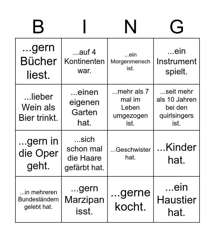 This bingo card has 16 words: ...gern Marzipan isst., ...Kinder hat., ...ein Morgenmensch ist., ...gern Bücher liest., ...gern in die Oper geht., ...auf 4 Kontinenten war., ...Geschwister hat., ...gerne kocht., ...lieber Wein als Bier trinkt., ...einen eigenen Garten hat., ...in mehreren Bundesländern gelebt hat., ...ein Instrument spielt., ...sich schon mal die Haare gefärbt hat., ...seit mehr als 10 Jahren bei den quirlsingers ist., ...mehr als 7 mal im Leben umgezogen ist. and ...ein Haustier hat..