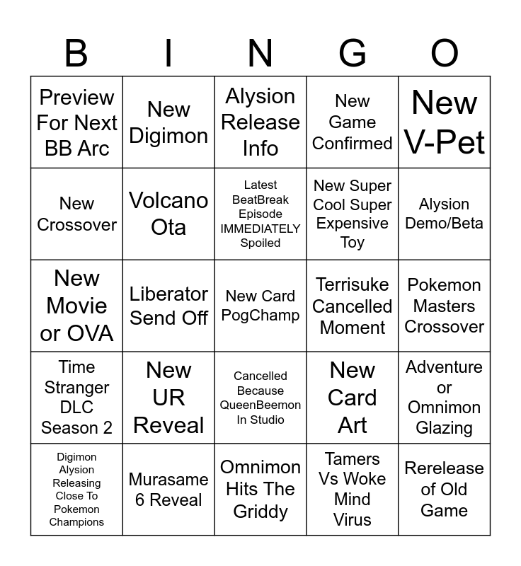 This bingo card has a free space and 24 words: New UR Reveal, Murasame 6 Reveal, Latest BeatBreak Episode IMMEDIATELY Spoiled, Digimon Alysion Releasing Close To Pokemon Champions, New V-Pet, Preview For Next BB Arc, New Crossover, New Digimon, Terrisuke Cancelled Moment, Cancelled Because QueenBeemon In Studio, New Super Cool Super Expensive Toy, New Movie or OVA, New Card Art, Adventure or Omnimon Glazing, Volcano Ota, Tamers Vs Woke Mind Virus, Pokemon Masters Crossover, Alysion Release Info, Alysion Demo/Beta, Liberator Send Off, Rerelease of Old Game, Time Stranger DLC Season 2, New Game Confirmed and Omnimon Hits The Griddy.