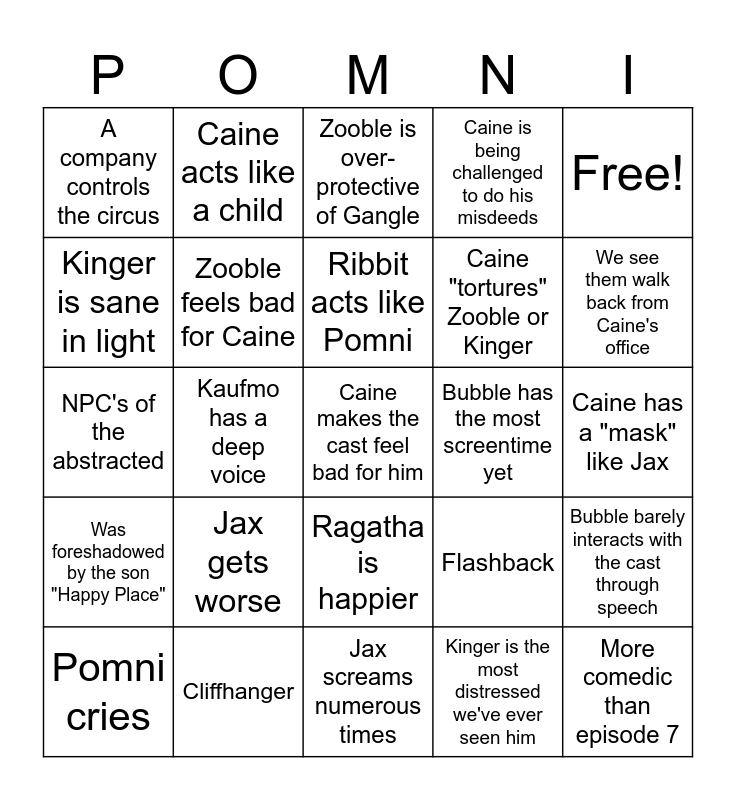 This bingo card has a free space and 24 words: Jax gets worse, Cliffhanger, Ribbit acts like Pomni, Pomni cries, Free!, A company controls the circus, Kinger is sane in light, Caine acts like a child, Bubble has the most screentime yet, Ragatha is happier, Caine "tortures" Zooble or Kinger, NPC's of the abstracted, Flashback, Bubble barely interacts with the cast through speech, Zooble feels bad for Caine, Kinger is the most distressed we've ever seen him, Caine has a "mask" like Jax, Zooble is over-protective of Gangle, We see them walk back from Caine's office, Kaufmo has a deep voice, More comedic than episode 7, Was foreshadowed by the son "Happy Place", Caine is being challenged to do his misdeeds and Jax screams numerous times.