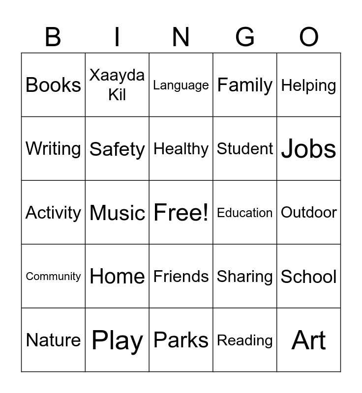 This bingo card has a free space and 28 words: School, Teacher, Student, Reading, Writing, Language, Xaayda Kil, Community, Education, Nature, Activity, Family, Play, Parks, Jobs, Learning, Home, Safety, Healthy, Friends, Books, Story, Art, Music, Outdoor, Sharing, Helping and Fun.